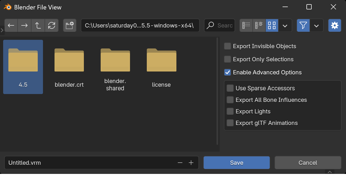 Select File → Export → VRM(.vrm) from the menu to display the VRM export dialog. Press the Save button to export the currently edited armature as a VRM file.