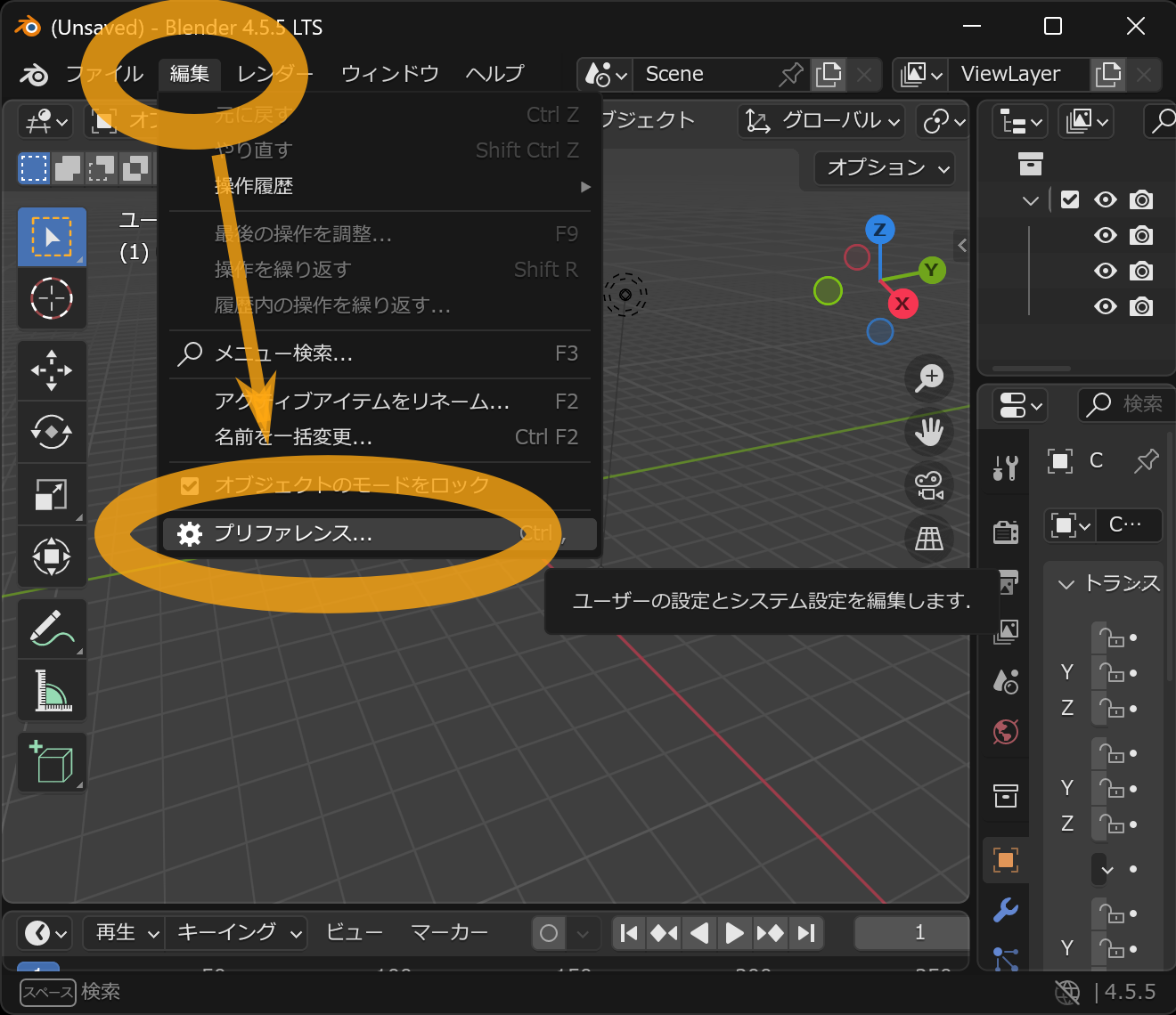 次にBlenderを起動し、メニューの 編集 → プリファレンス を選択します。