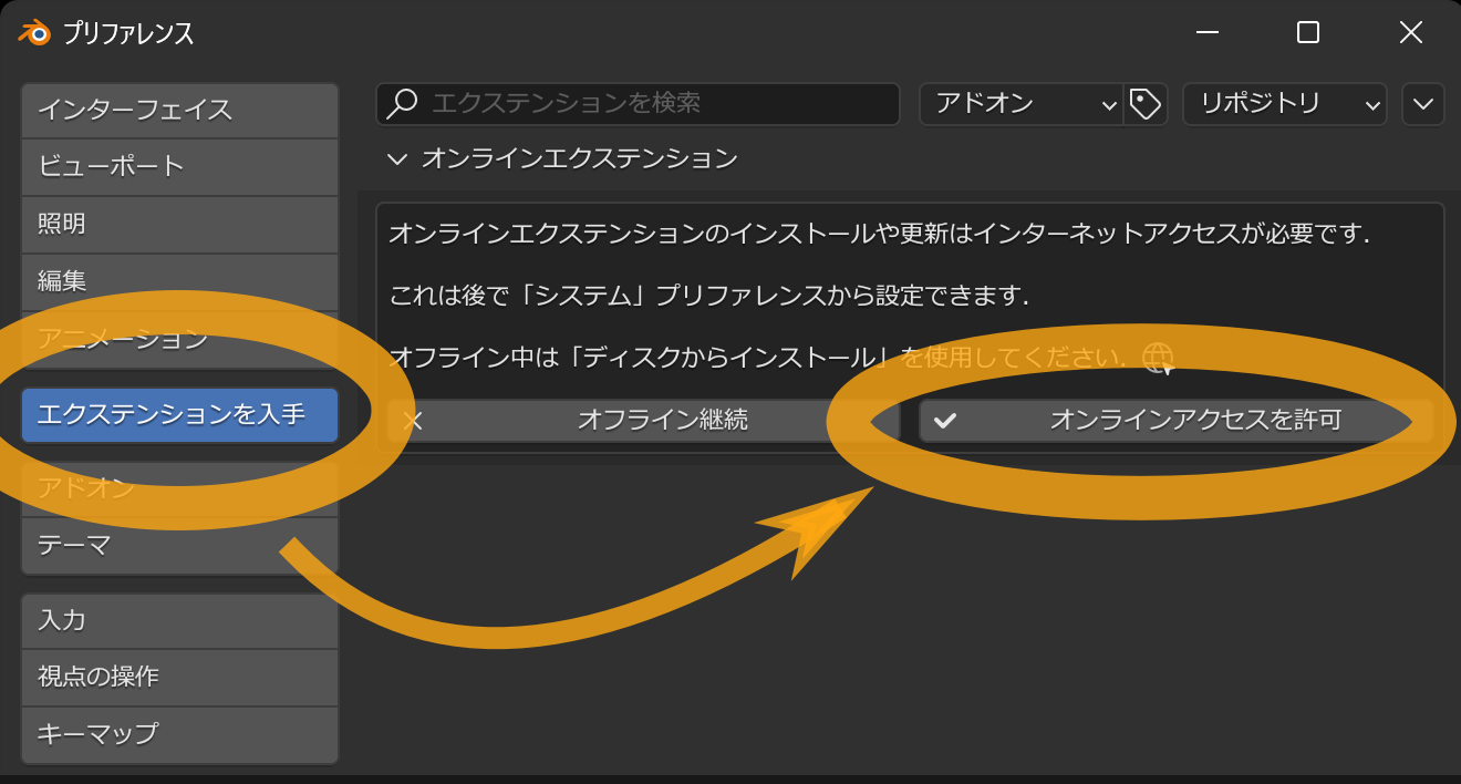 ここでもし「オンラインエクステンションのインストールや更新はインターネットアクセスが必要です。」 という趣旨のメッセージが表示されたら オンラインアクセスを許可 ボタンを押してください。