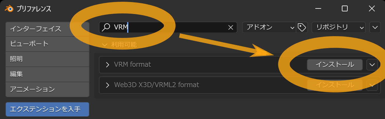 次にアドオン一覧表示から Import-Export: VRM format を探します。