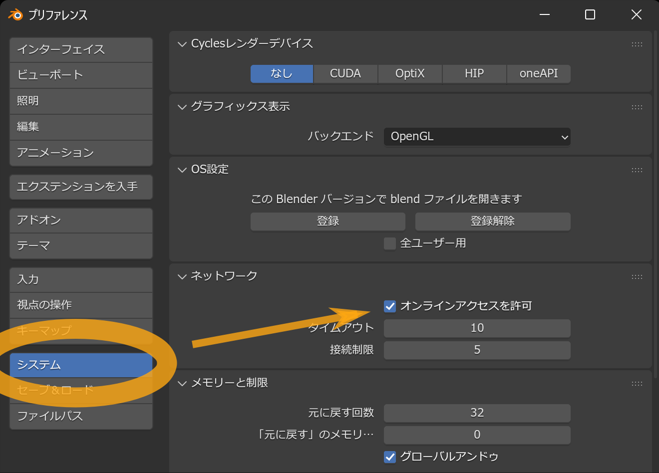 「オンラインアクセスを許可」ボタンを押すと、Blenderがインターネットとの通信を行うことができるようになります。 もしそれを行いたくない場合は、Blender 4.2以降をご利用かつ、Webブラウザからダウンロードする場合の手順でインストールしてください。