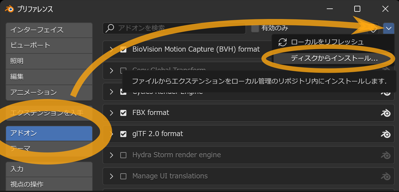Blender 4.2以降では、Blenderの設定画面からダウンロードとインストールを行うことができます。また、アドオンのアップデートが公開された場合、設定画面でボタンを押すだけでアップデートが実行できるようになります。