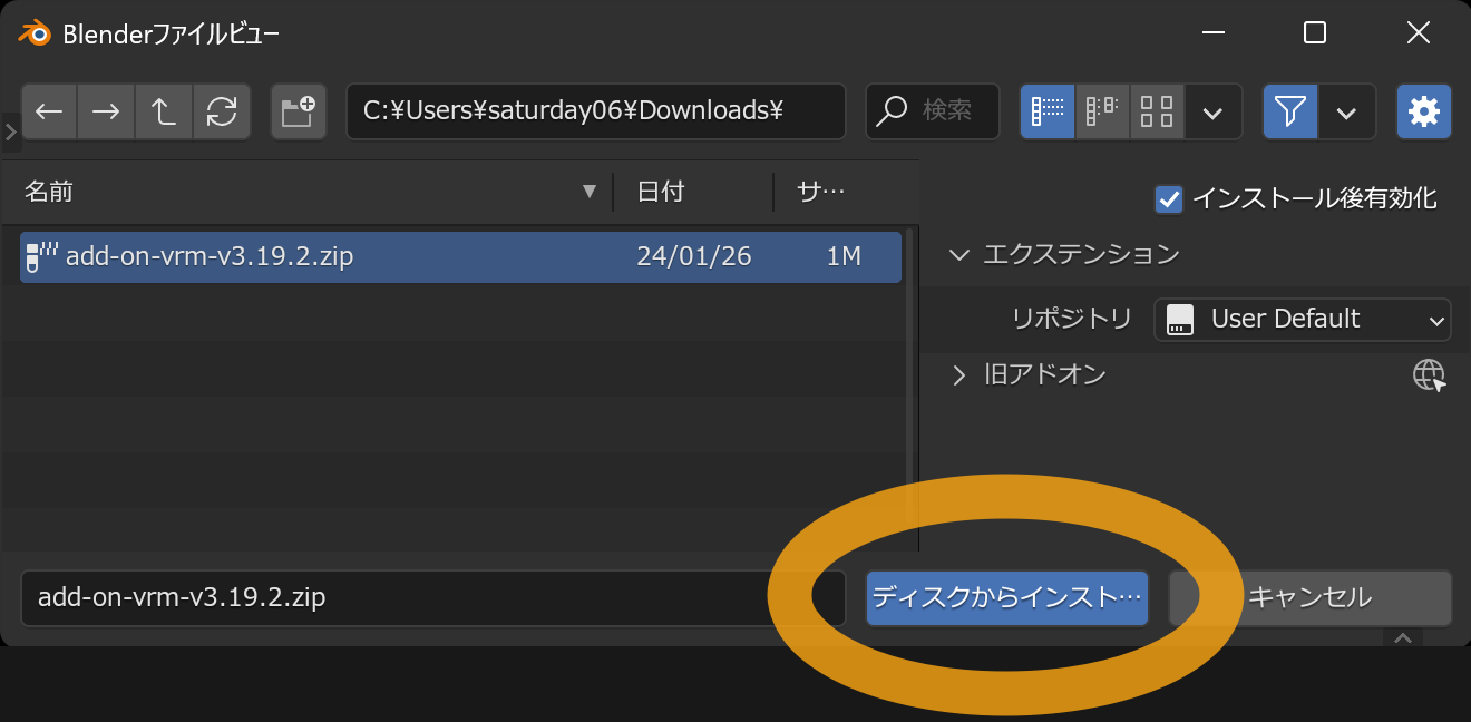 ファイルを開くウィンドウが表示されるため、先ほどダウンロードしたアドオンファイルを選択し、ファイル名の末尾が .zip になっていることを確認してから ディスクからインストール ボタンを押します。